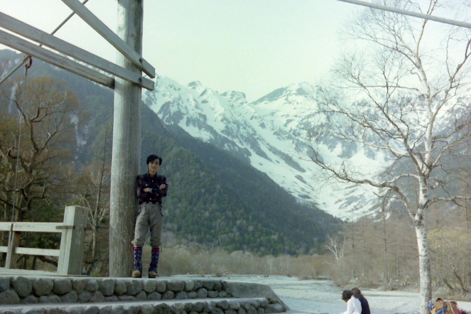 さて3日,初めて上高地に足を踏み入れる。予想通り大量の雪で夏道はトレースはあるもののずっと雪の上を明神~徳沢~横尾、と大勢の登山者とぬきつ、ぬかれつ、ぬかれつ...で涸沢をめざす。天気は昼頃晴れ間が見えていたりしたのに、横尾本谷付近から雨となり、涸沢小屋についた時にはずぶぬれになってしまった。おまけにカサをまたも忘れてきてしまったので休むこともできずバテバテになってしまった。