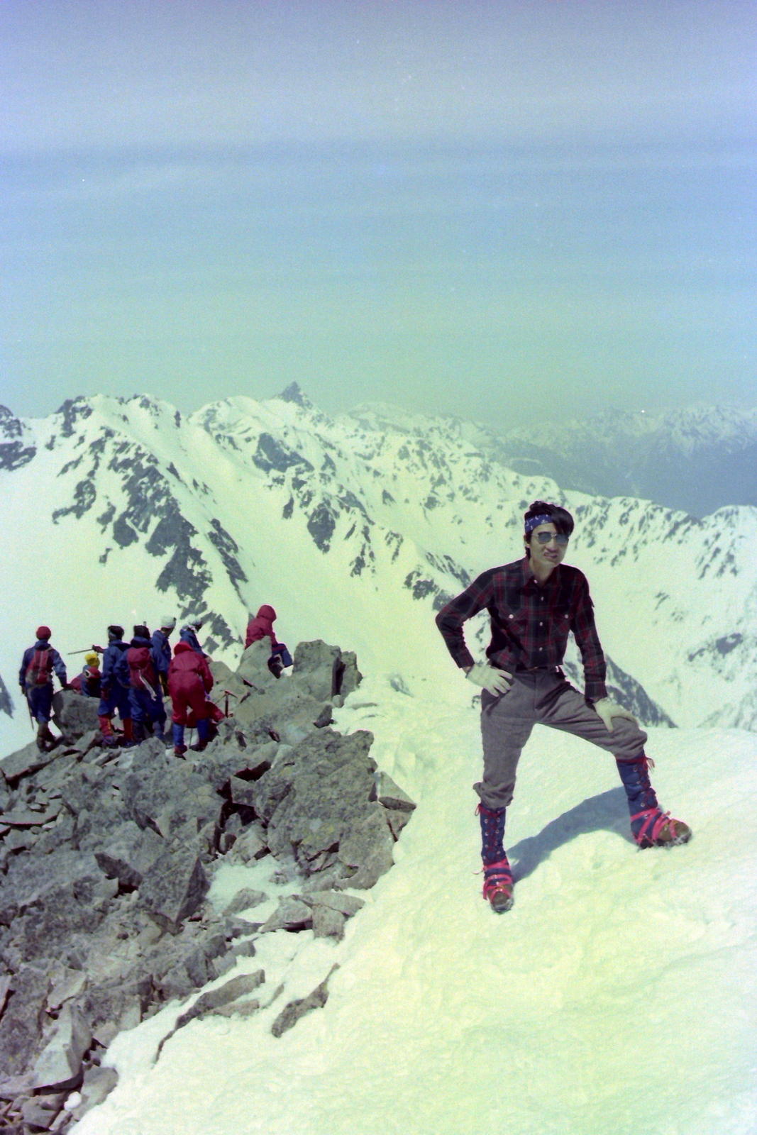 4日は朝から晴れ。快晴とはいかないが晴れである。予定の北穂から涸沢槍コースは指導員の言に従いあきらめて直接、白出コルに向う。コース上はそれこそアリの行列の如く登山者がひしめいている。我々は9:00頃出発。途中、日がさしてきて真夏を思わせたが3ピッチでなんなくコルへ。時間がメチャクチャ余って、こんなことなら北穂に行くんだったか、と思ったが気を取り直して涸沢岳へ。これも一応3100m、槍がやっと見えた。北穂~涸沢岳の稜線はさすがに人が少ない.北穂へ登っていった人の数は、白出コルへ登ってきた人の数とさほど変わらなかったように思えたのだが。