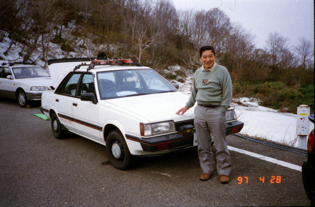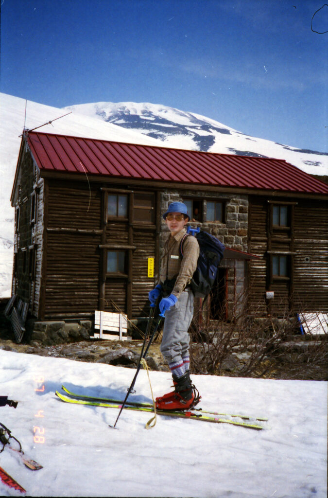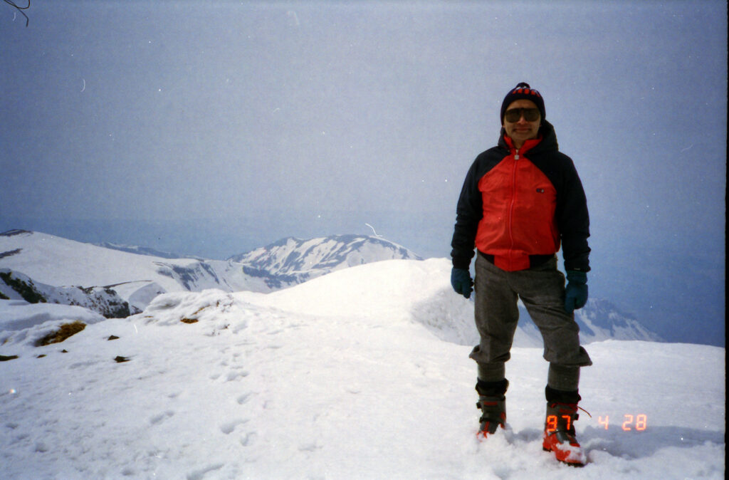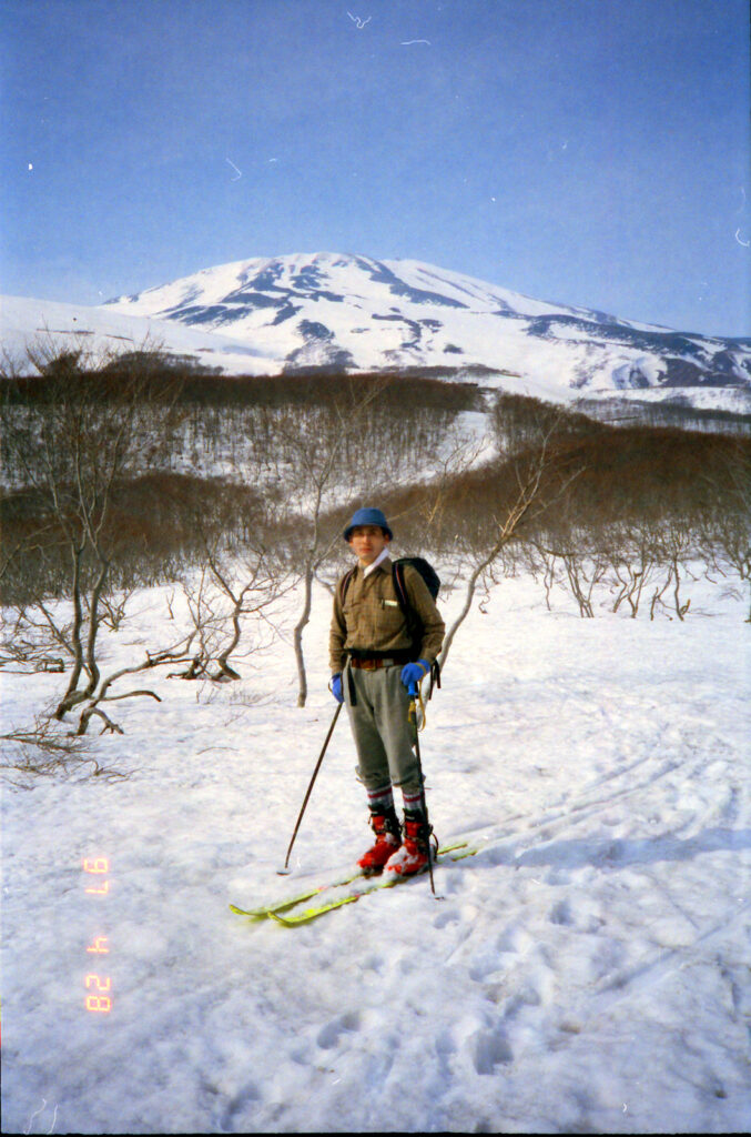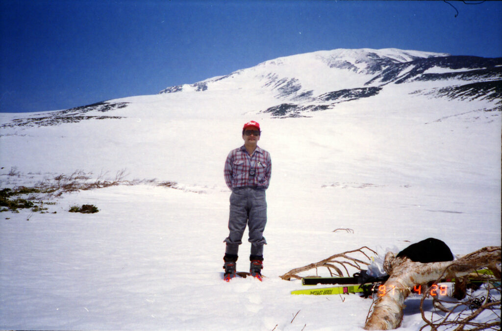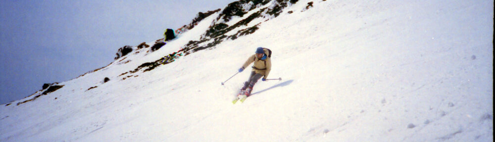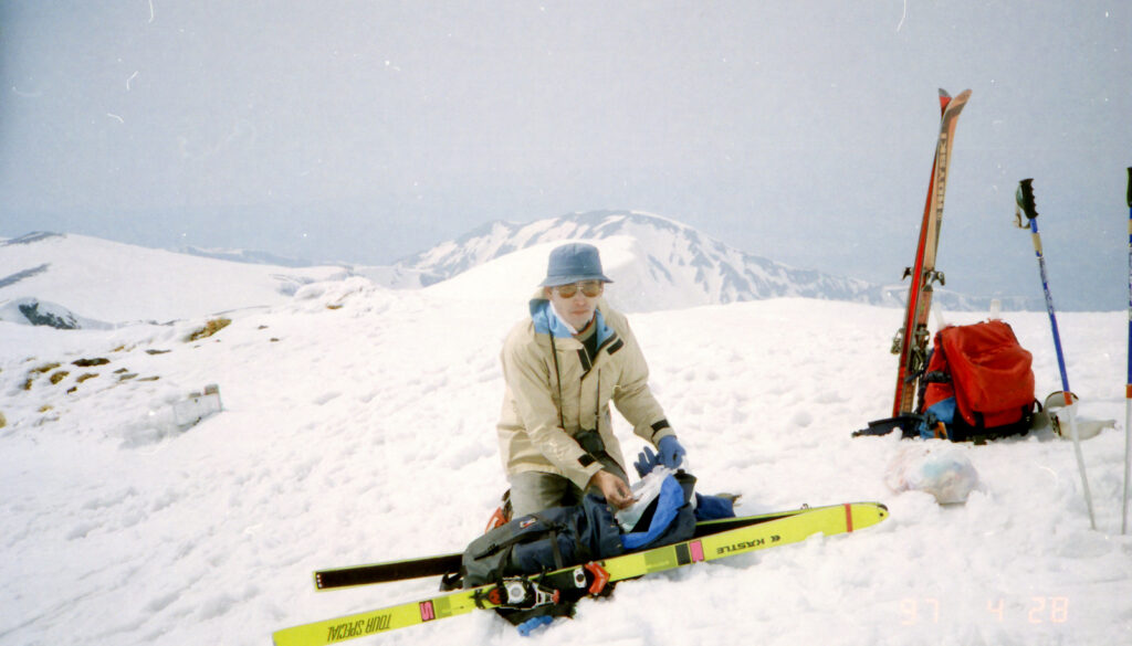 大台野道は650m付近までしか車で上がれない.ここは除雪はしない道路で雪解けを待つのみだという.夏場だと湯の小屋口の駐車場(林道終点)の1000m付近まで車で上がれるので頂上へは最短のコースとなるようだ.伏拝岳(ふしおがみだけ)の直下は急斜面.登るのもステップを切りながらで気を使う.滑りは快適そのものだ.このような大斜面は他に類をみない.奥田さんの本では5時間半ぐらいで往復できるように記述があるが,ちょっとハイペースすぎるようだ.