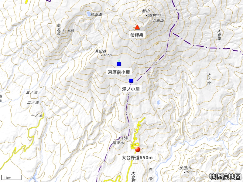 コースタイム 湯の台/大台野道行き止まり点cont650m/650—cont750m/720—(cont850m-1000m=ぶなの切通し)—cont1150/滝の小屋930/1000—cont1550m/河原宿小屋付近(雪で埋っている)1050—cont1900m(ハイ松帯)/1235/1250—1400伏拝岳(2130m) 1425—cont850m/1525—cont650m/1540. 高度差1480m・総所要時間=8時間50分.