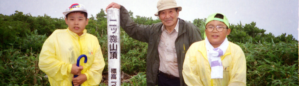 コースタイムの50%増しでようやく 二ツ森山頂へ到着. 腎臓の悪い親父にはちょっときついコースだったようである.太り気味の 次男と母は汗をかきながらも頑張っていた. 視界はあまりきかないが山の深さを感じさせる.晴れれば西に日本海, 北には白神岳方面が見えるはずである. 頂上から右手の方にもう一つのピークがすぐそこに望まれる. これが二ツ森のいわれになるようである.