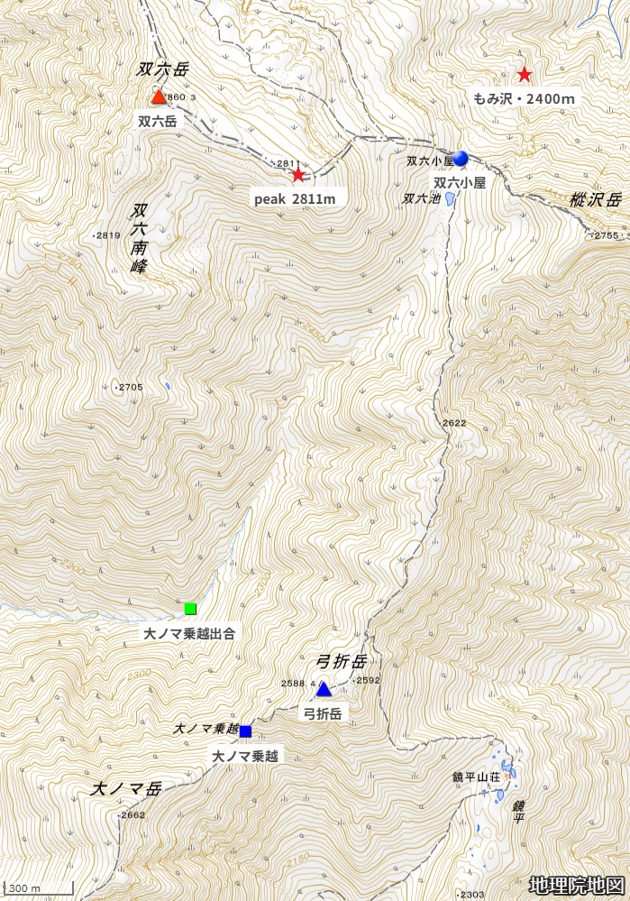 コースタイム:双六小屋7:05+++双六谷+++7:30大ノマ乗越取りつき点(cont.2250m) 7:50—8:48大ノマ乗越(cont.2450m) 9:20+++++10:20小池新道取りつき10:35—11:00ワサビ平小屋11:30—12:40新穂高駐車場.行動時間5時間35分.(+++はスキー滑降)
