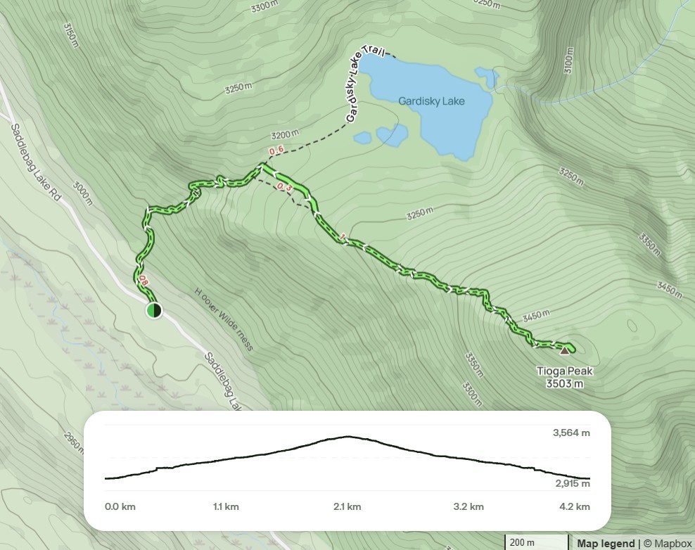 Day 1: 6/7 Tioga Peak Trail 1110 Gardisky Lake Campground and Trailhead (2970m) ~1216 Tioga Peak (3503m) ~1508 Parking