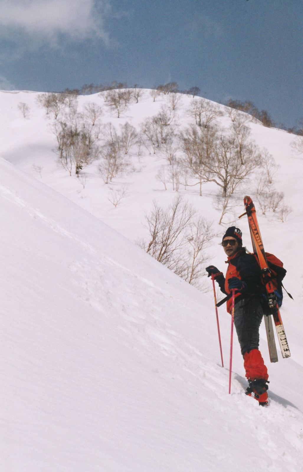 天候;曇り時々晴れ.風強し.総勢20ー30人にもなるたくさんの山スキーのパーティが入っていた.リフト終点のところは1855mであり,当日は運行されていなかったが運行時期に計画すれば1時間半はかせげる計算になる.1900m近くの沢をわたって尾根への登りは一苦労である.