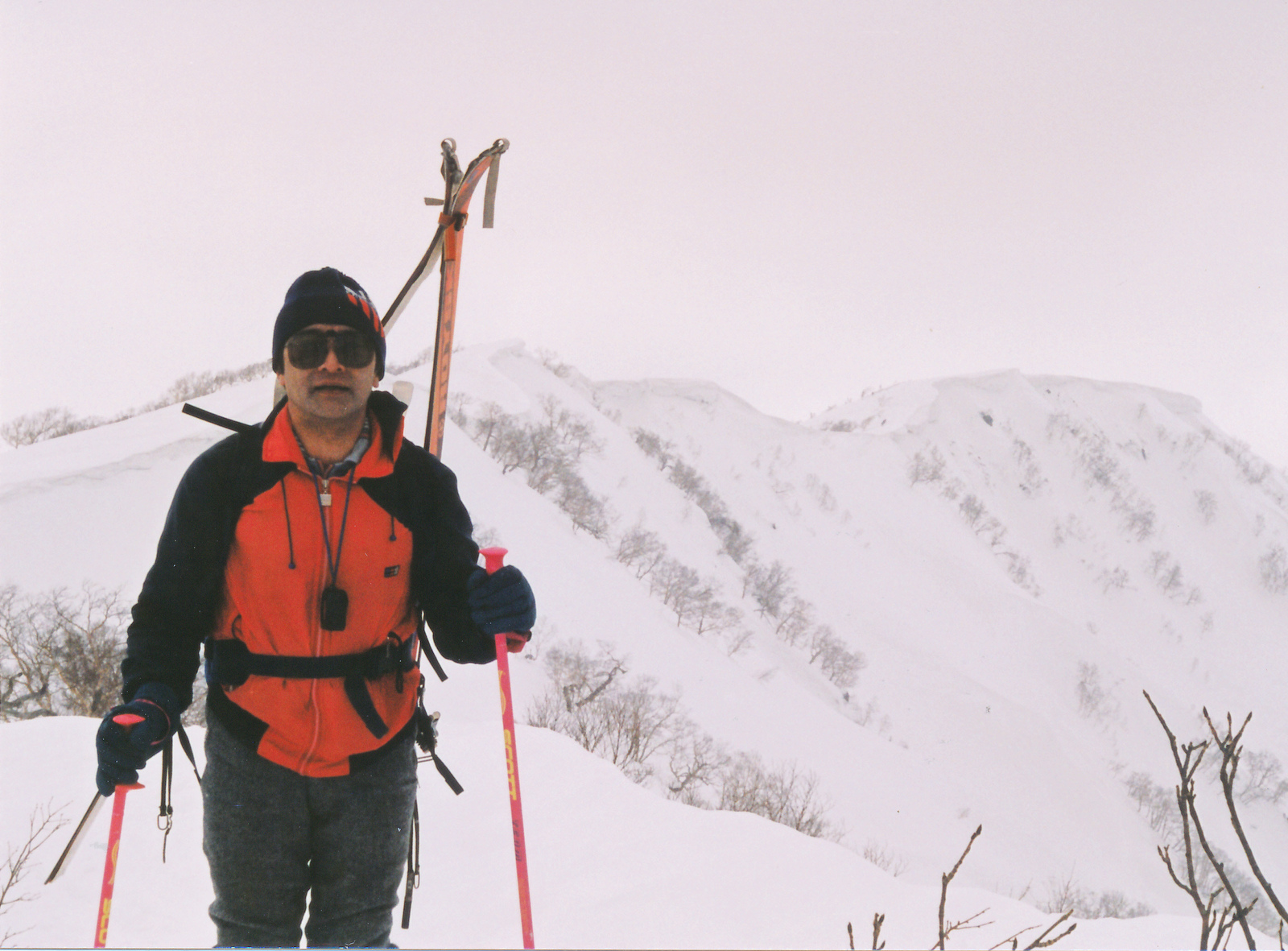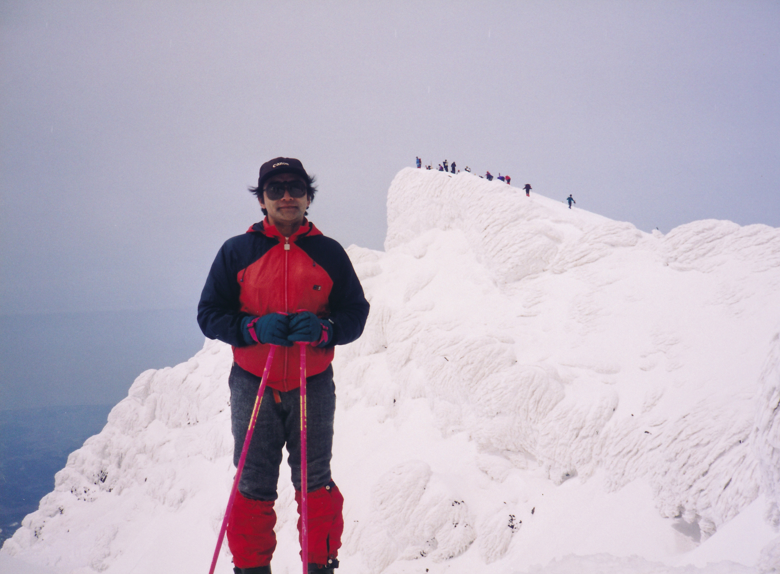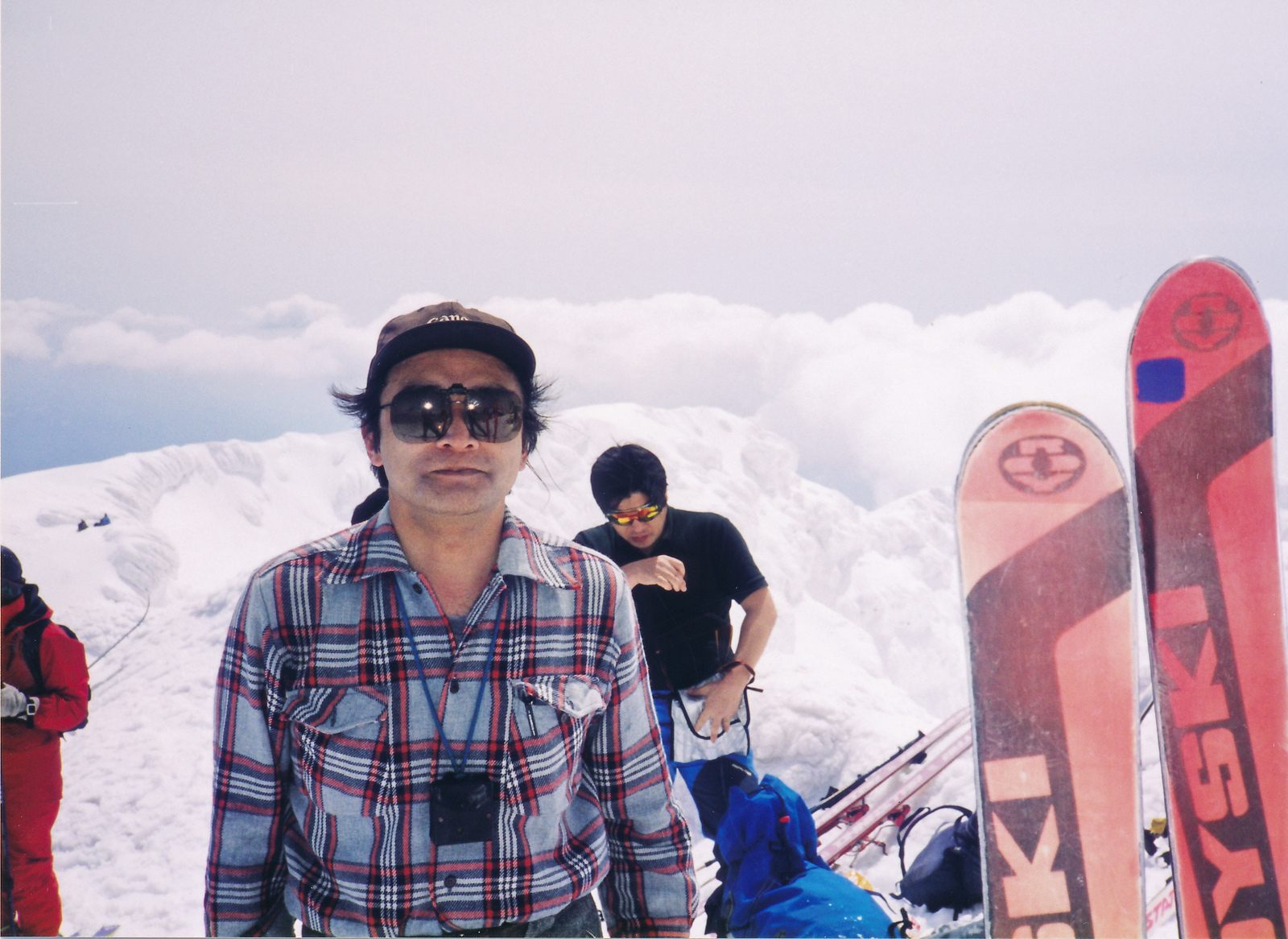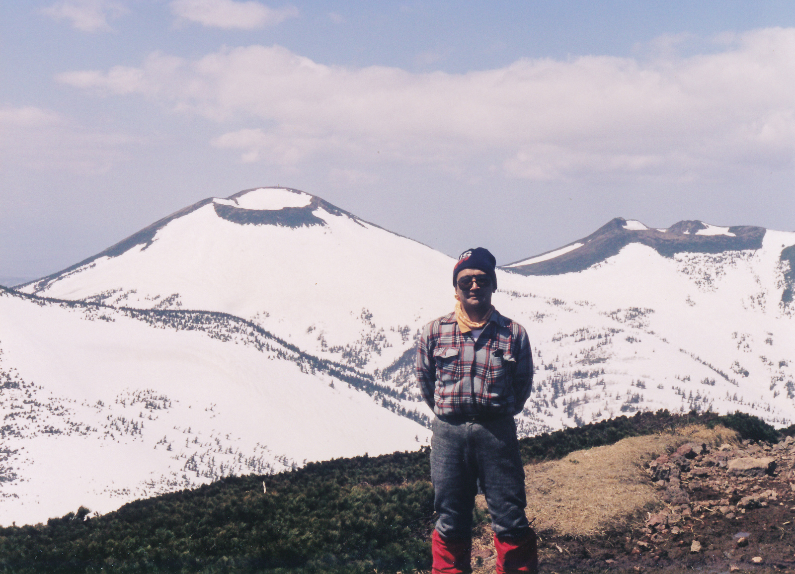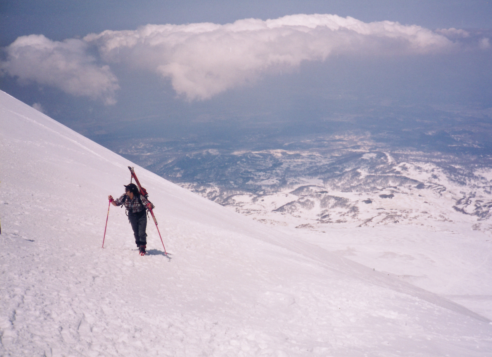 天候;晴れのち曇り.風なし.これほどまでに風のない鳥海山も珍しいのではないだろうか.天候に恵まれ,昨日の大風がうそのようである.ほとんどの人がシール登高で七高山まで至るが私は最後の1ピッチは階段登高に変更する.頂上は人で混雑している.まるでスキー場のリフト終点の休憩所のようである.ボーダもたくさんいる.女の子もちらほら.人気のある山になっている.