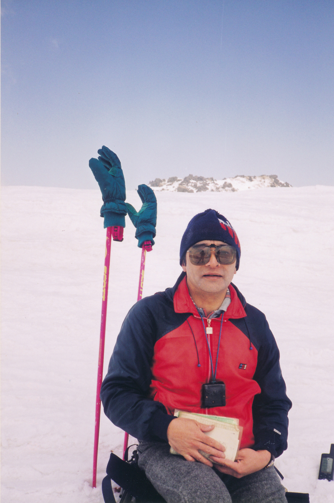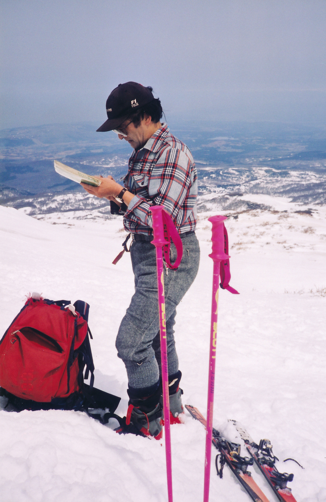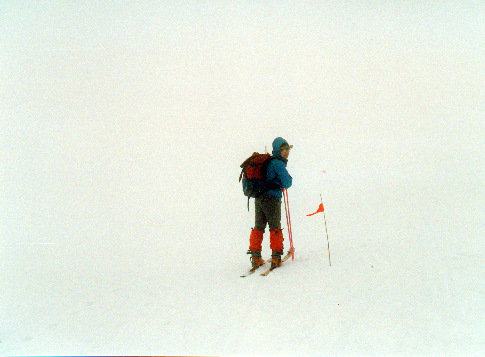11時をすぎてもまだ頂上に到達しない.赤旗のとれた竿だけになっており,かつガスも濃いので,ルートを見つけるのが困難になってきた.GPSによれば残りは200m~300mだが,天候も悪いので前進を中止する.11時08分.11時20分にスキーをつけて下り始める.前を行く浅野さんの姿もすぐに見えなくなってしまう.赤旗の間隔の視界もなくなる.平坦な雪原のところはまるで無夢状態のスキー滑降となった.