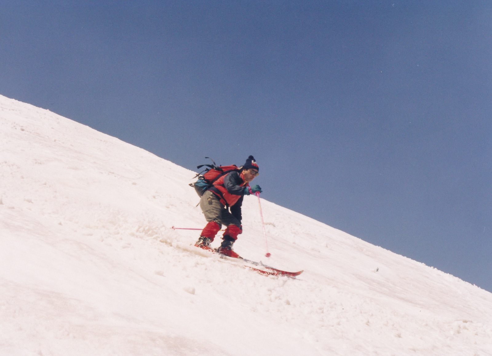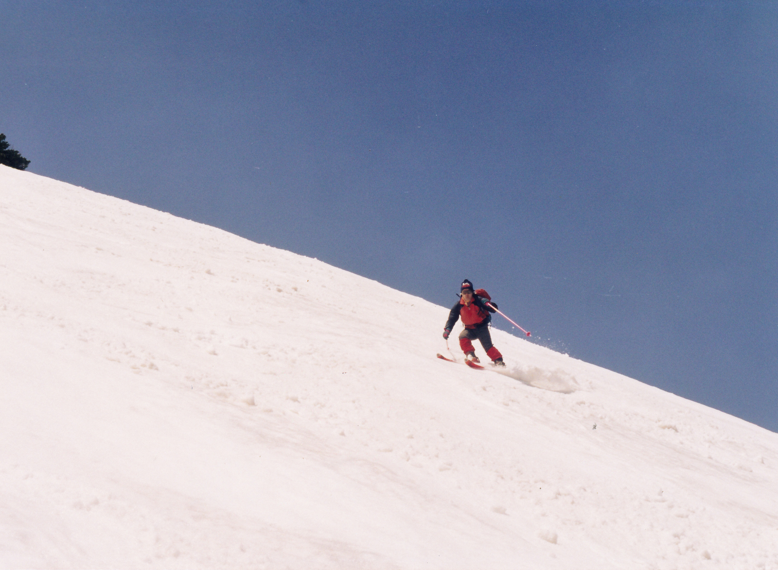今年は雪が多いのか滑り出しの斜面も斜度が小さいように思われる.大斜面はこれまでの登りの時間を忘れさせる.避難小屋手前で左手の斜面に入る.シュプールのない斜面に自分のスキーで曲線を描く.気持ちのいい瞬間である.祓川への道路は4/29 8:30に開通したという.その前夜には雪が舞ったようだ.登り=3時間半(高低差1050m)下り=40分