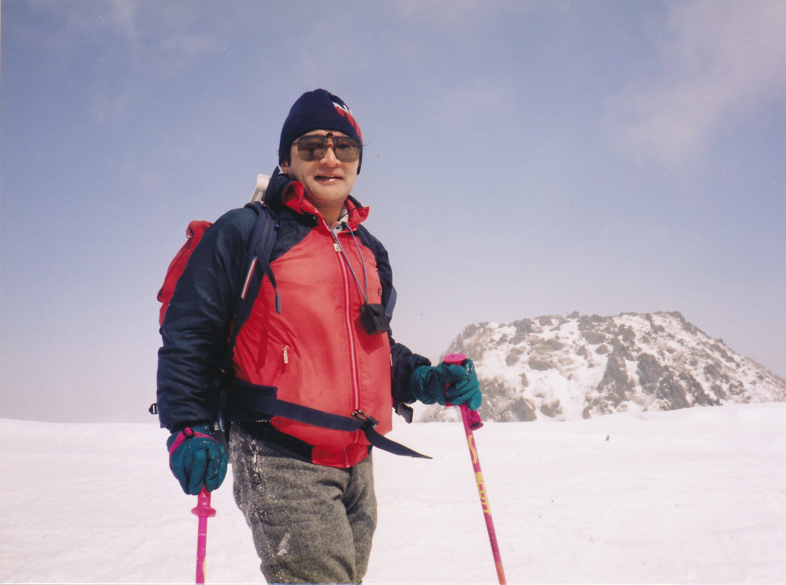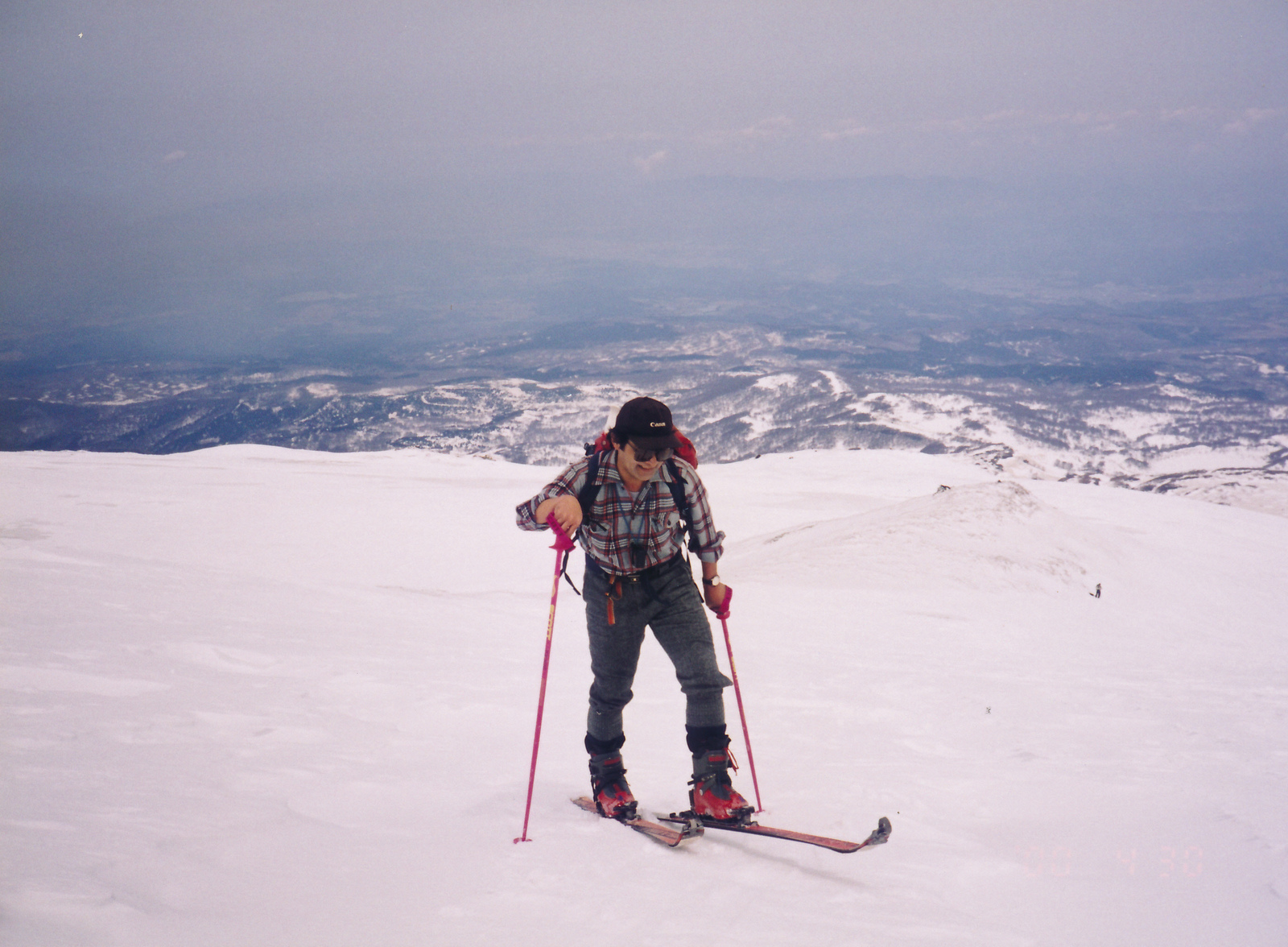 キャンプ場からは山がよく見えたので山行を決行する.今年は雪が多いので雪の壁は5m以上もあって取りつくのもひと苦労である.反射板までは坪足で高度をかせぐ.風が強い.反射板から頂上へは平坦な登高が続く.赤旗が20mおきぐらいに雪原に置かれている.登るにつれて天候が悪くなり霧雨状態になり先の見通しが悪くなる.頂上からは2パーティ/4人がスキーで下ってきた.途中,急登があり,シールから階段登高に切り替える.10時40分ごろである.