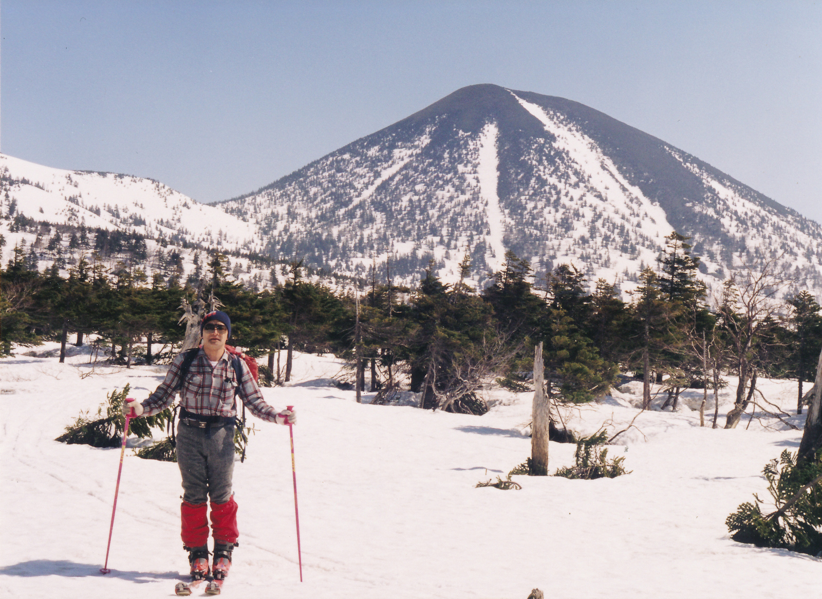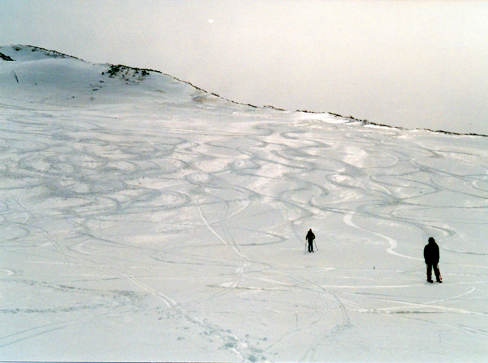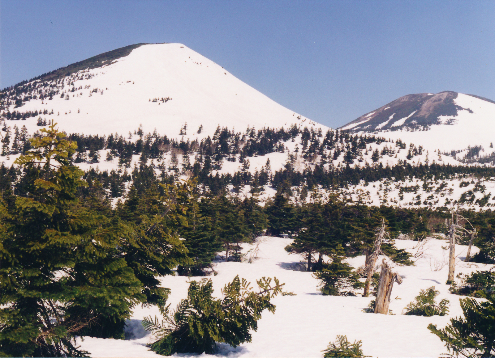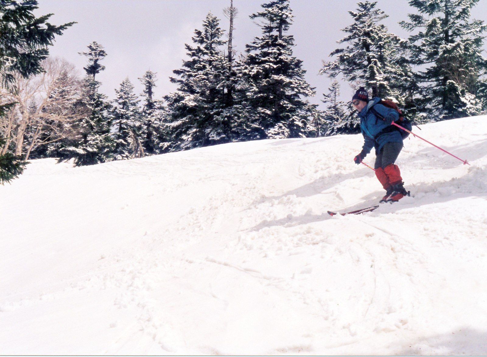 広大な斜面は八甲田でも一番醍醐味があるところだろう.谷地温泉の親父には迷いやすいとずいぶんおどかされる.山頂で朝方櫛ガ峰まで往復してきて,今日は2本目という元気な秋田の人に出会う.
