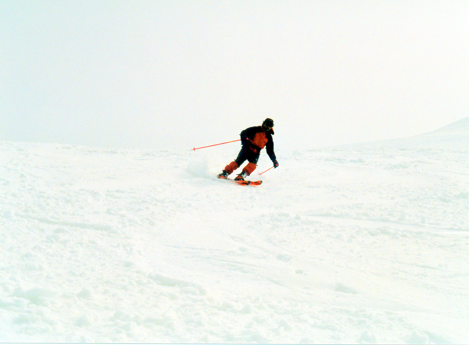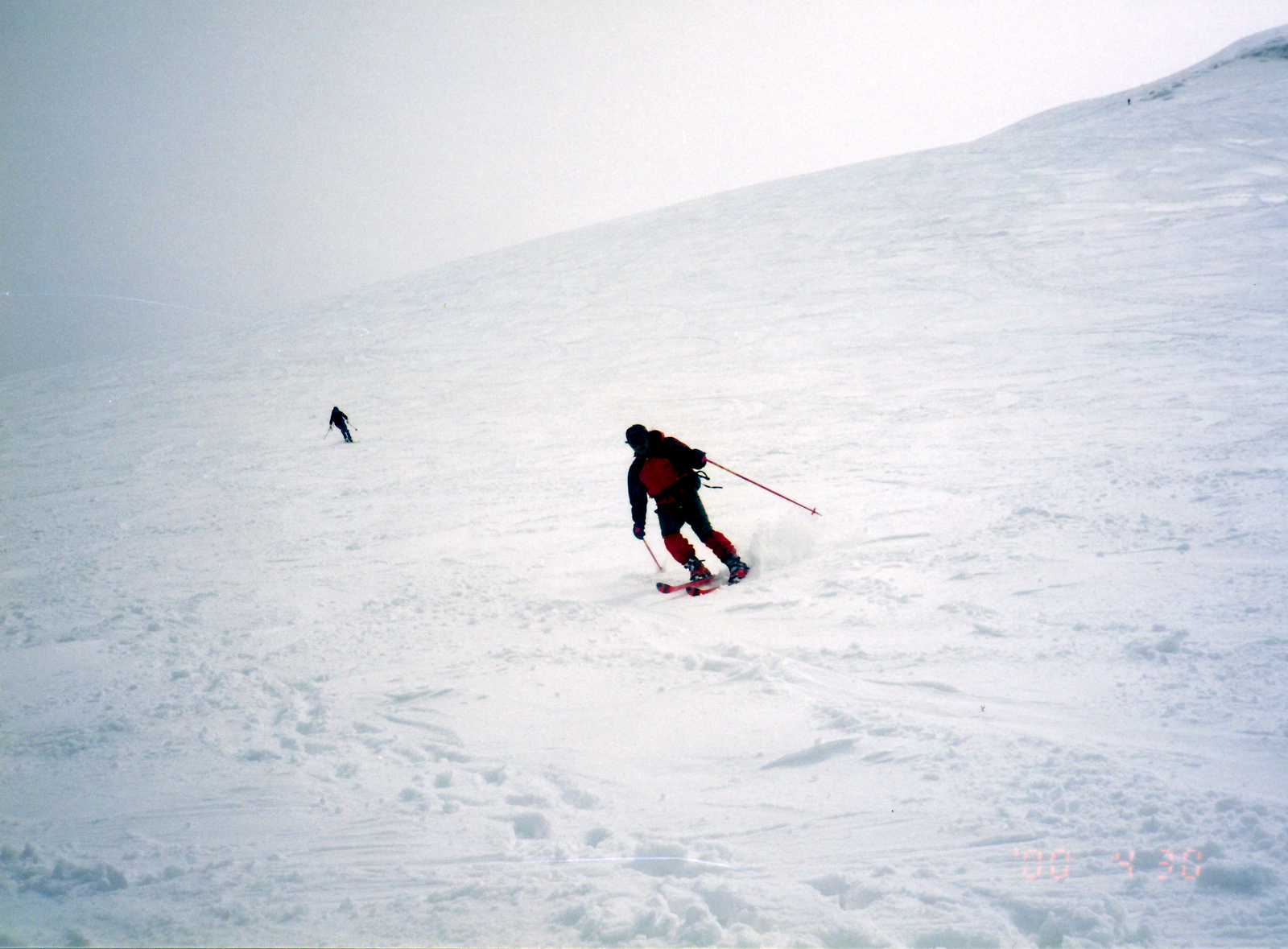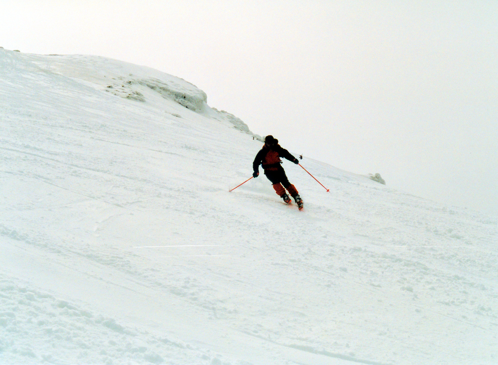 反射板のところまで来てもまだガスが晴れない.ここからは急斜面となる.視界は極めて悪いが足元のスキーで斜度を感じながら慎重に滑る.最後のひと滑りになってやっと道路への滑落防止用に設置されたネットが見えてきてほっとする.親父から携帯に電話がかかり,車を回してもらう.車を待っている間にコーヒーを沸かして一服.このコースはいつも天候には恵まれない.