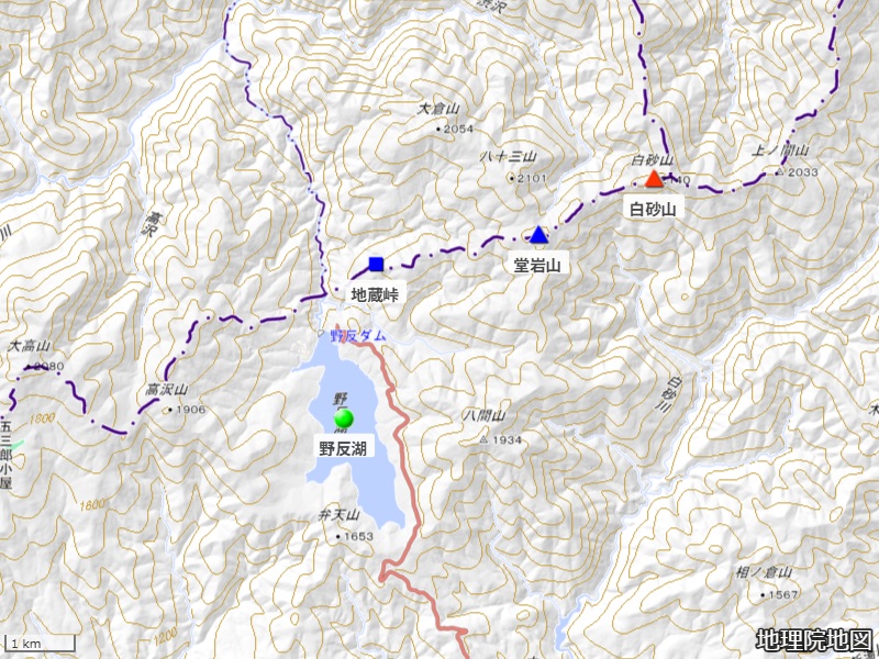 コースタイム テントサイト07:35—登山口08:40—地蔵峠下の沢/橋08:53—09:15地蔵峠—09:42 cont.1802mピーク(cont 1802m)—10:18 cont.1880ピーク(cont.1880m)—11:00堂岩山(cont.2051m)/昼食—12:18白砂山(cont.2139m)/昼食12:55—13:53八間山分岐—14:30水場入り口—1510—15:24地蔵峠–16:00登山口—16:10サイト