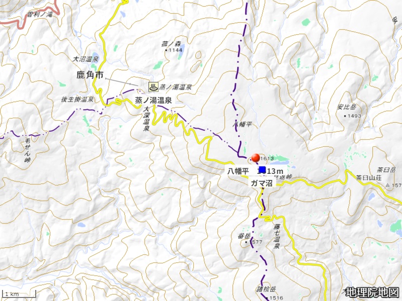 コースタイム 登山口1058—ガマ沼—1133 八幡平山頂(cont.1613.3m) 1220—1223 (cont.1604m)—1233 (cont.1450m)—1240 (cont. 1280m)—1250 道路合流点—蒸ノ湯入り口(取りつき点不明で引き返す)—(山毛森)—1325 リフト終点1355—1358 駐車場 行動時間3時間,高度差約600m.