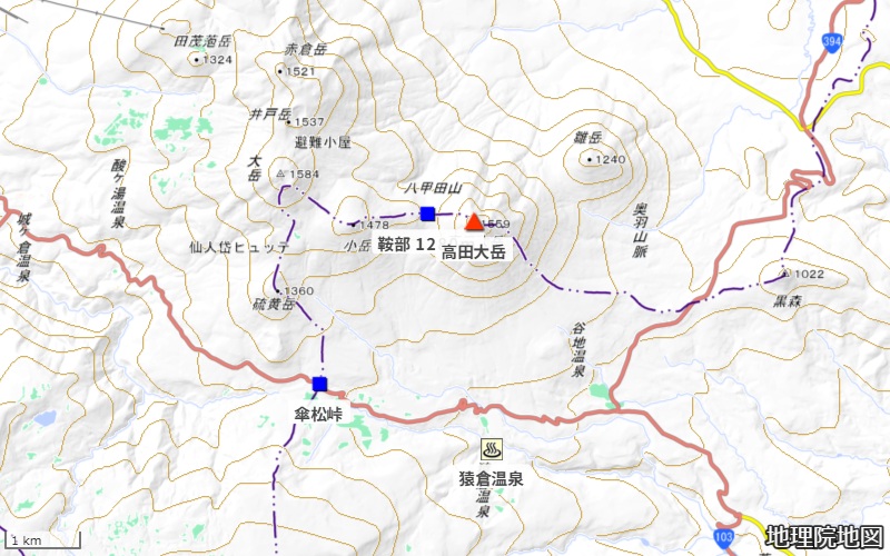コースタイム 傘松峠(cont.1040m) 0858—0930 (cont.1090m)—(沢をトラバース)—0940 (cont.1170m)—0958 (cont.1220m)1020—1030 鞍部(cont.1280m)—シール脱(cont.1350m付近)—這い松ブッシュ/雪なし—1110 夏道合流点—1127東部サブピーク—1130高田大岳山頂(cont.1552m) 1230—南方の這い松帯—1240大斜面上部1250—1300(cont.1020m)—1310道路合流点/猿倉温泉分岐手前(cont.870m)—1325猿倉温泉駐車場. 行動時間=4時間30分,高度差約700m.