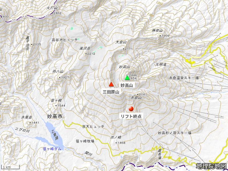 コースタイム 0710起床—ゴンドラ終点出発0910—0950スキー場中部—1020尾根上部—1050三田原スキー場リフト終点(cont.1855m)—1120尾根取りつき—1310 cont.2347—1350三田原山—cont.2300西部 1420—1457リフト終点—1600ゴンドラ終点—1630駐車場