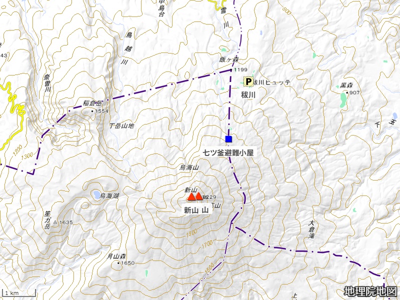 祓川駐車場(cont.1180m) 0855—0920 cont.1340m付近(cont.1340m) —1003七ツ釜避難小屋(cont. 1570m) —(シール→階段登高へ)—1228七高山(cont 2229.9m) 1300—1325 新山—1340七高山1355—1435祓川下部駐車場