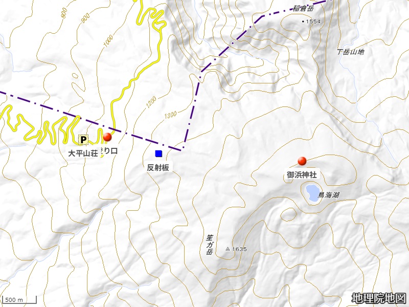 コースタイム 大平登山口(cont. ~1100m) 0838—0927反射板(cont.1380m) —-1108御浜神社手前約200m/悪天のため前進中止(cont. 1700m)1120—1140大平登山口